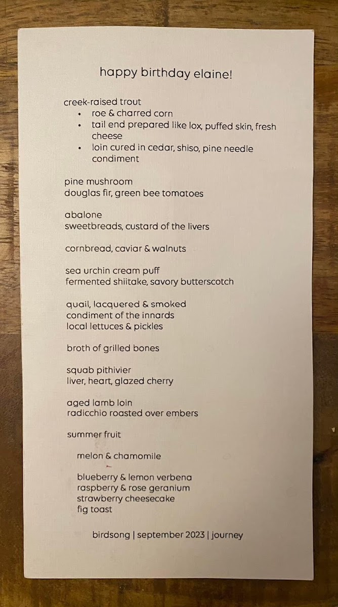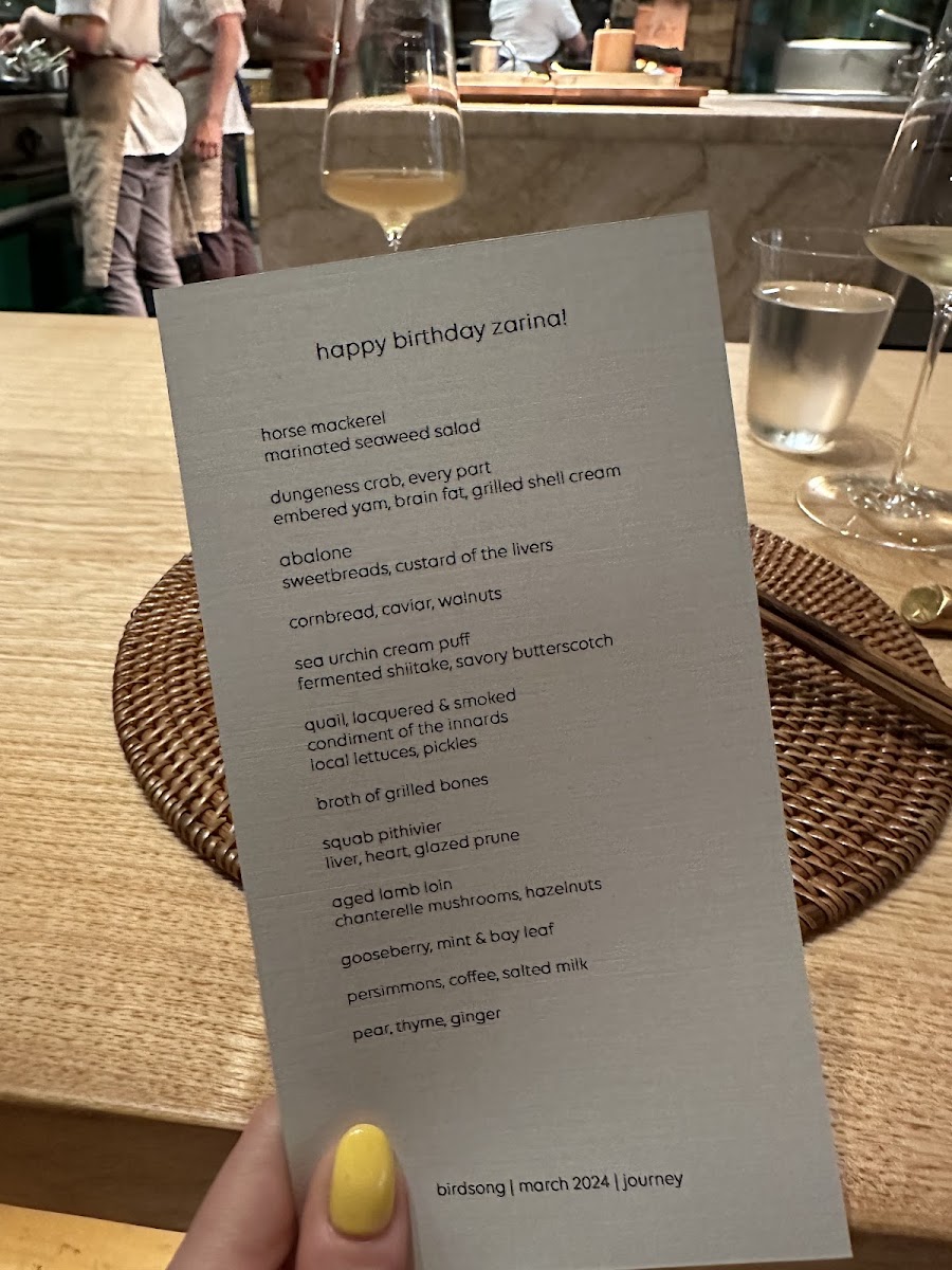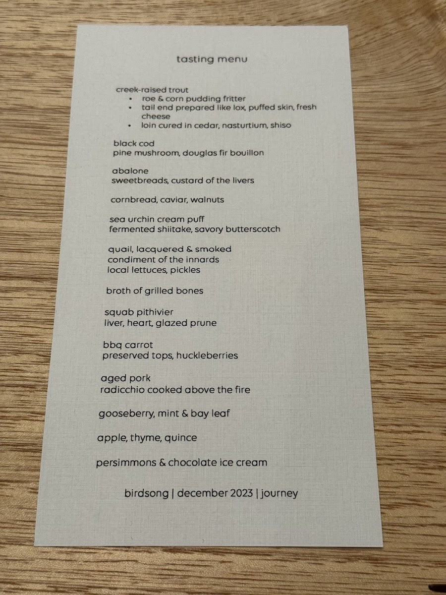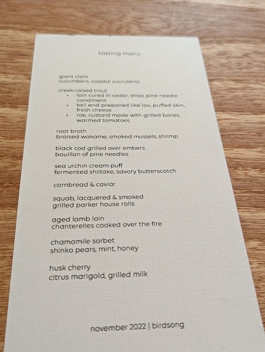 Birdsong's menu is a celebration of flavor and creativity, delivering a memorable dining experience that pushes the boundaries of modern cuisine. Whether you're a seafood lover or a fan of innovative twists on classic dishes, the tasting menu provides a thoughtfully curated journey that is both refined and exciting.