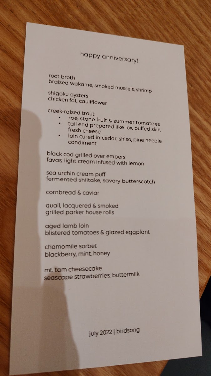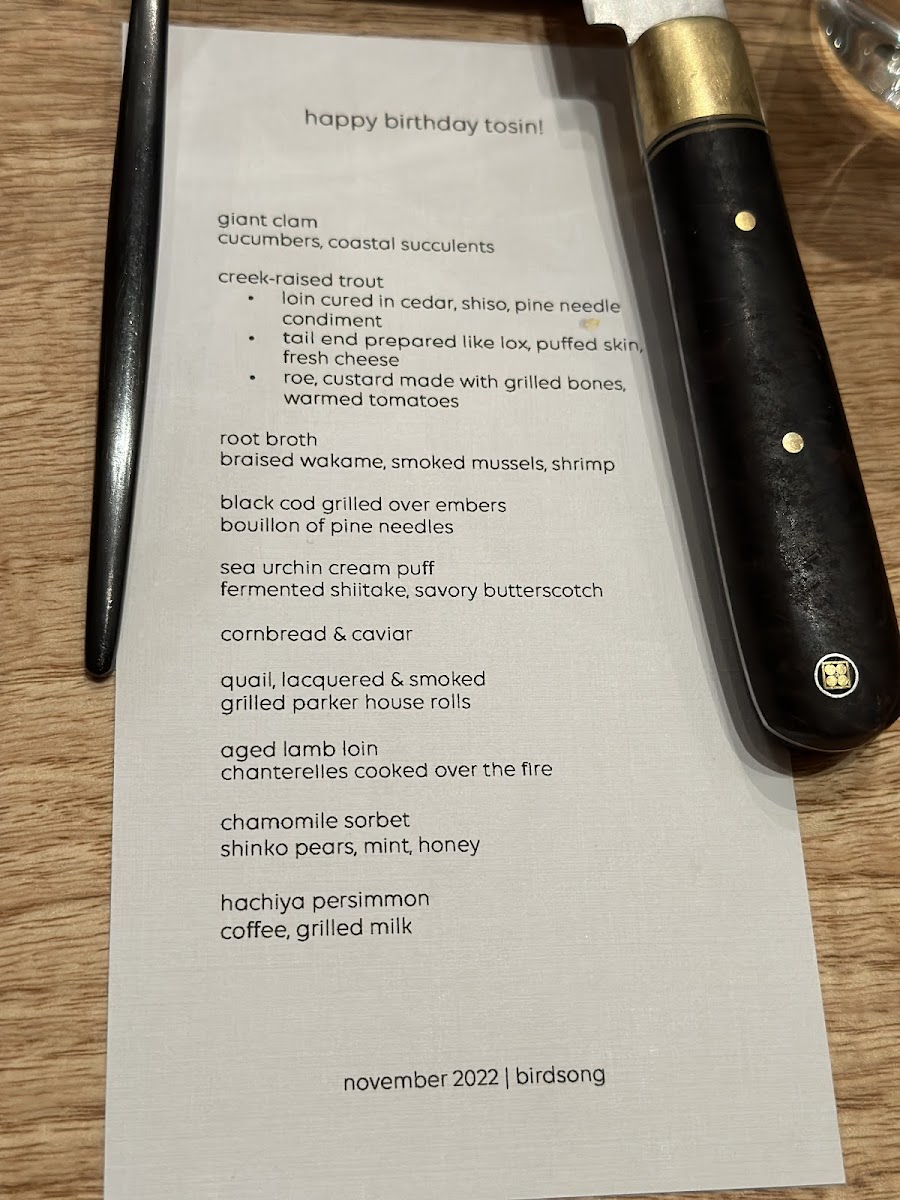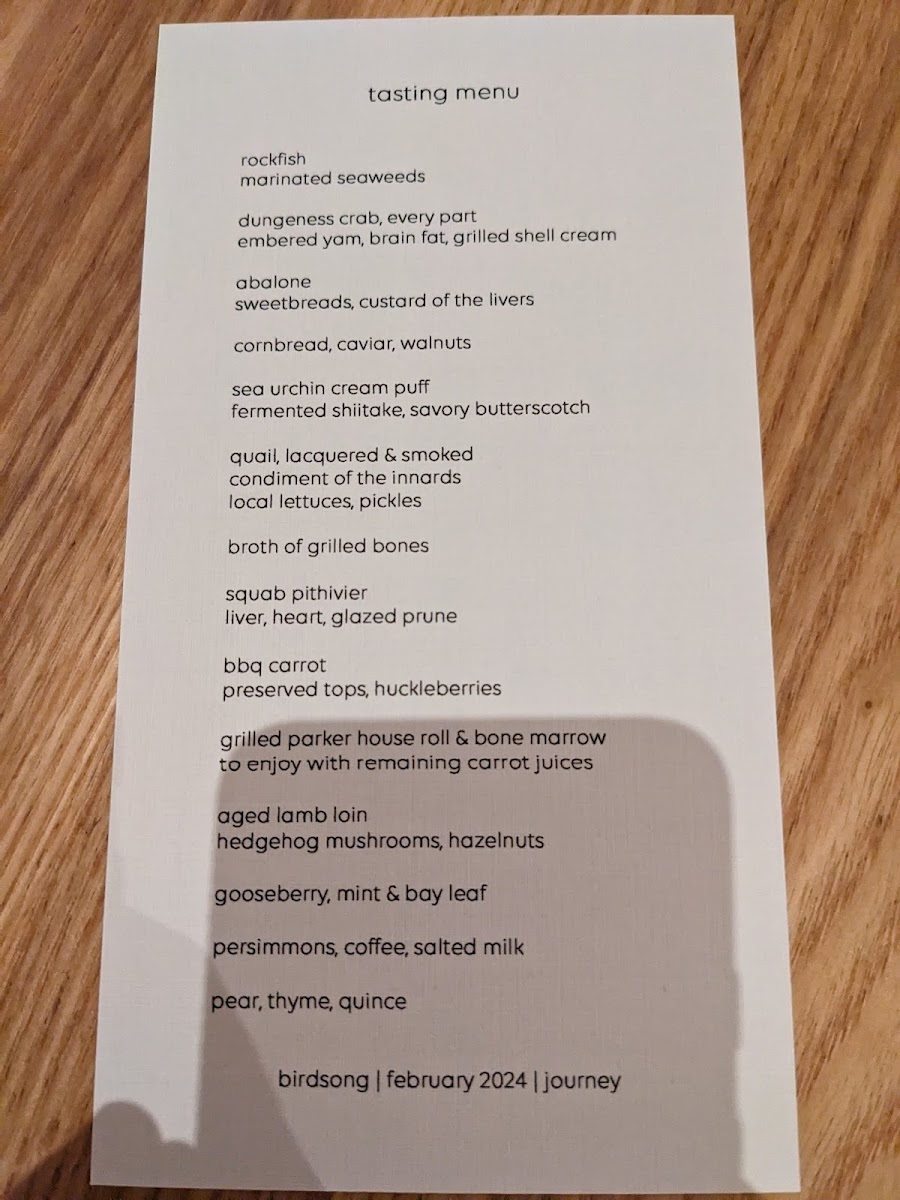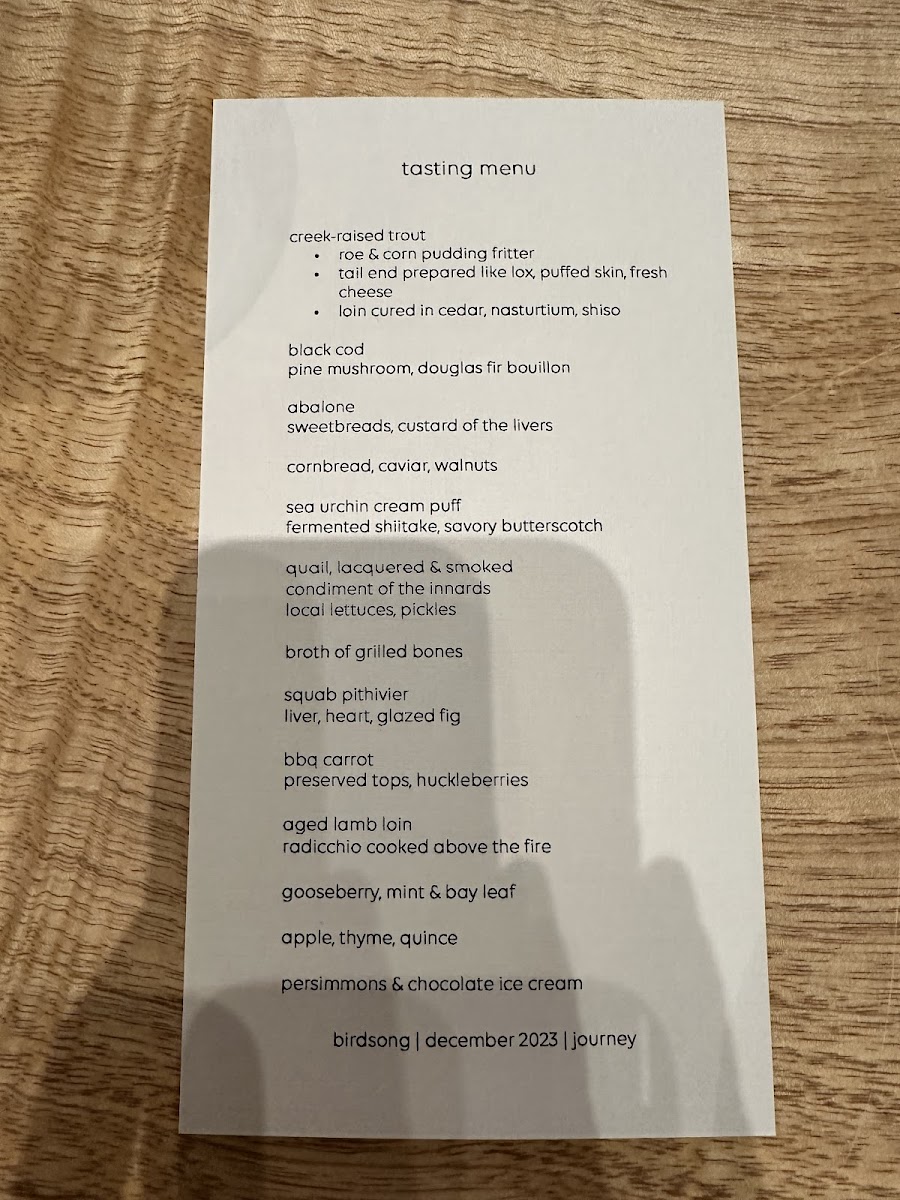 Birdsong's menu is a celebration of flavor and creativity, delivering a memorable dining experience that pushes the boundaries of modern cuisine. Whether you're a seafood lover or a fan of innovative twists on classic dishes, the tasting menu provides a thoughtfully curated journey that is both refined and exciting.
